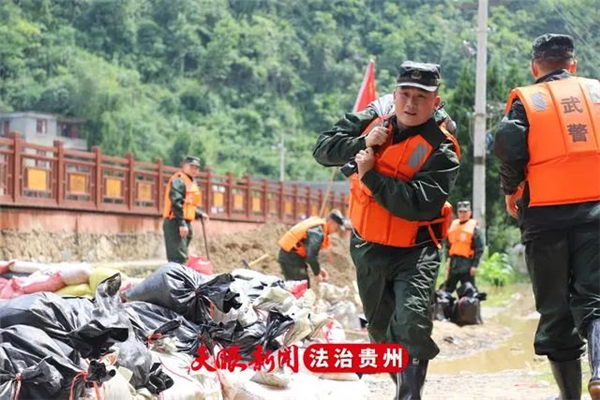 6月9日,贵州黔东南苗族侗族自治州龙江河龙江村段洪水冲垮堤坝,武警官兵在滔滔洪水中迅疾展开救援,经过4个多小时持续奋战,构筑了一道长30米、高0.8米的防洪堤坝。