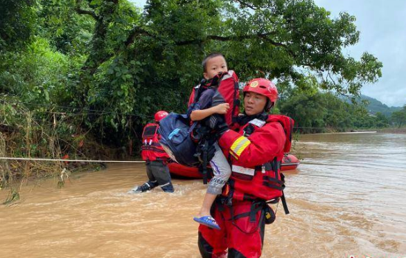 在贵州罗甸县,持续降雨阻断了学生的上学路,消防救援人员划着皮划艇逐一接送焦急等待的学生, 辗转6次,成功将23名被困学生送至对岸。