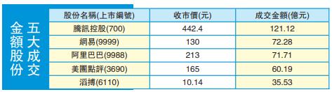 新經濟股網易(9999)第二上市,首日掛牌,收市比招股價升近6%,美團(3690)亦創新高,曾高見169.5元,收市升3%。阿里巴巴(9988)升至220元水平後,倒跌收市。