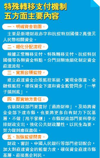 許宏才在當日國務院政策例行吹風會上表示,建立特殊轉移支付機制,是特殊時期採取的特殊做法,是宏觀調控方式的制度創新,是積極財政政策的重要內容,也是紓困和激發市場活力的重要工具,主要包括明確資金範圍、細化分配流程、實施台賬監控等五方面內容(詳見列表)。