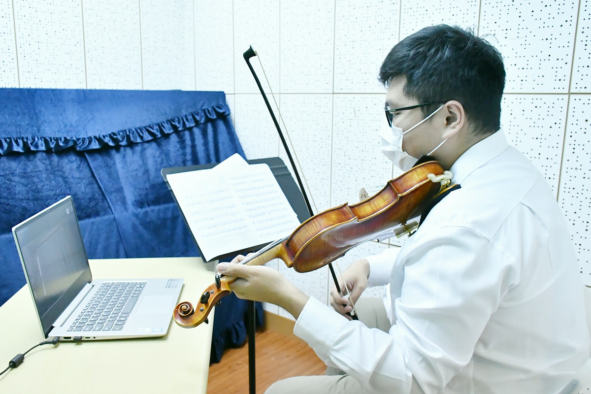 記者採訪當日,小提琴導師王健聰正在網上授課,只見他對着視像鏡頭演奏,同時指導三位學生。王健聰指,網上教學比起實際上課時要做更多備課工作,需要預先選好曲子,並要清楚在樂譜上給學生註明哪個地方用什麼弓法和指法:「授課時老師要讓學生看清楚自己的指法,手部位置要經常對着鏡頭作示範,同時老師要看見學生的指法,如有出錯,就要馬上作出指導。」王健聰補充,網上授課每次要面對三位學生,要做到互相交替而不浪費教學時間,比實際上課時更難。可幸學院導師大多擁有豐富教學經驗,很快就適應了這種線上教學模式。