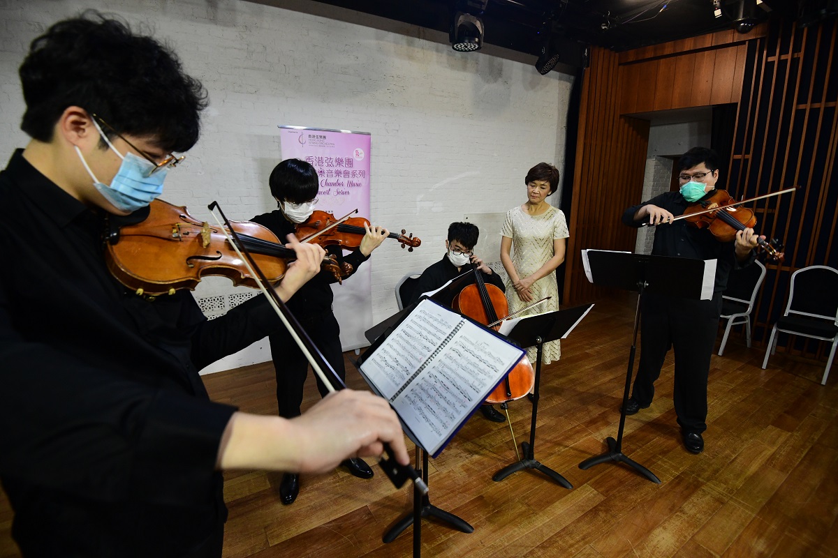 網上音樂會直播前,音樂家進行綵排,姚珏(右二)到場探班。