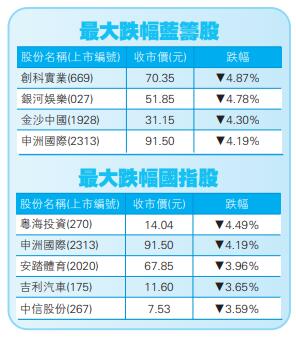 藍籌股近乎全軍覆沒,汇控(005)跌2.1%、騰訊(700)跌1.7%、港交所(388)跌3%、友邦(1299)挫3.1%、銀娛(027)挫4.8%、創科(669)挫4.9%,為包尾藍籌。長建(1038)升0.2%,為唯一錄得升幅藍籌。