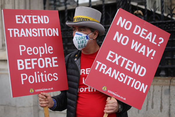 倫敦一名示威者舉起牌子,要求延長脫歐過渡期。 網絡圖片