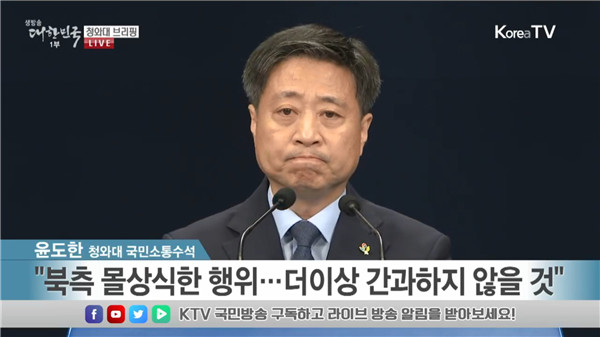 青瓦台國民溝通首席祕書官尹道漢今天早上發表談話回應朝韓關係升溫,對朝鮮拒絕接受特使派遣感到遺憾,呼籲朝鮮應遵守《919軍事協議》,並表示,「一旦朝鮮真的採取軍事行動,將會付出代價。」