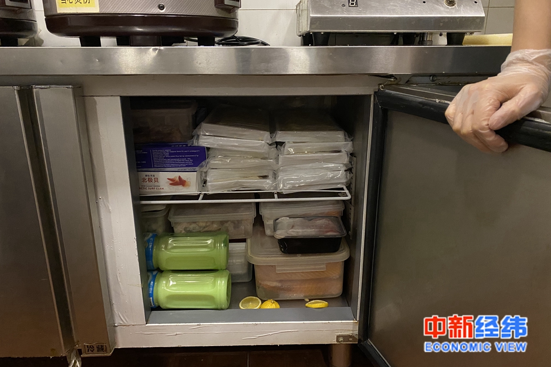 後厨的冰柜裏都是刚下架的生鲜。 中新经纬 付玉梅 摄