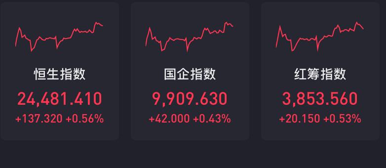 截至收盤,恒生指數漲0.56%,報24481.41點;國企指數漲0.43%,報9909.63點;紅籌指數漲0.53%,報3853.56點。大市成交額1042.42億港元。