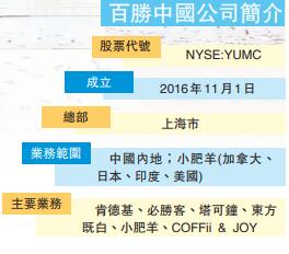 百勝中國是百勝餐飲集團(Yum!Brands)在內地的特許經營商,於2016年從百勝餐飲集團分拆出來,在紐約證券交易所獨立上市,在內地市場目前擁有肯德基(KFC)、必勝客(PizzaHut)、塔可鐘(TacoBell)三個品牌在中國內地的獨家運營和授權經營權,並完全擁有東方既白、小肥羊和COFFii&JOY連鎖餐廳品牌。