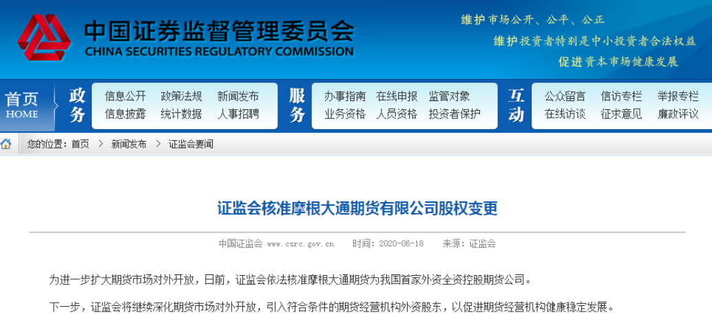 证监会在相关批复中称,根据《期货交易管理条例》《期货公司监督管理办法》和《外商投资期货公司管理办法》等有关规定,经审核批复摩根大通期货股权变更,公司应当依法办理变更登记等相关事宜。