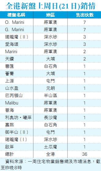 布少明預期,同區二手樓銷售會因SEAtoSKY的推出而變得安靜。市場數據顯示,其他區的一手樓貨尾銷售也幾乎處於「窒息」的狀態。周日其他新盤合共售出8個單位,其中恒大旗下的珺瓏灣系列兩期一共售出3伙,佔比超過三成。上周六的一手貨尾售出28伙,會德豐(020)將軍澳OceanMarini和GrandMarini、Marini合共售出14伙,佔推出量的一半。另外,將軍澳早前新盤的尾貨包括晉海、Malibu亦見零星成交。