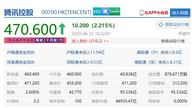 6月22日上午消息,腾讯控股涨2.215%,现报470.60港元,重回470港元关口,为2018年3月19日以来最高。