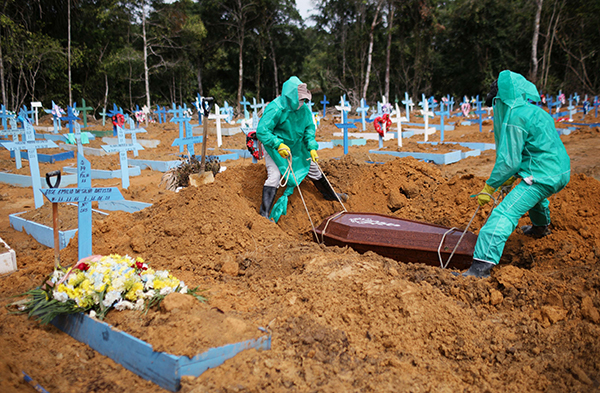 在巴西聖保羅,衛生人員全副保護套裝為一名新冠肺炎死者下葬。網絡圖片