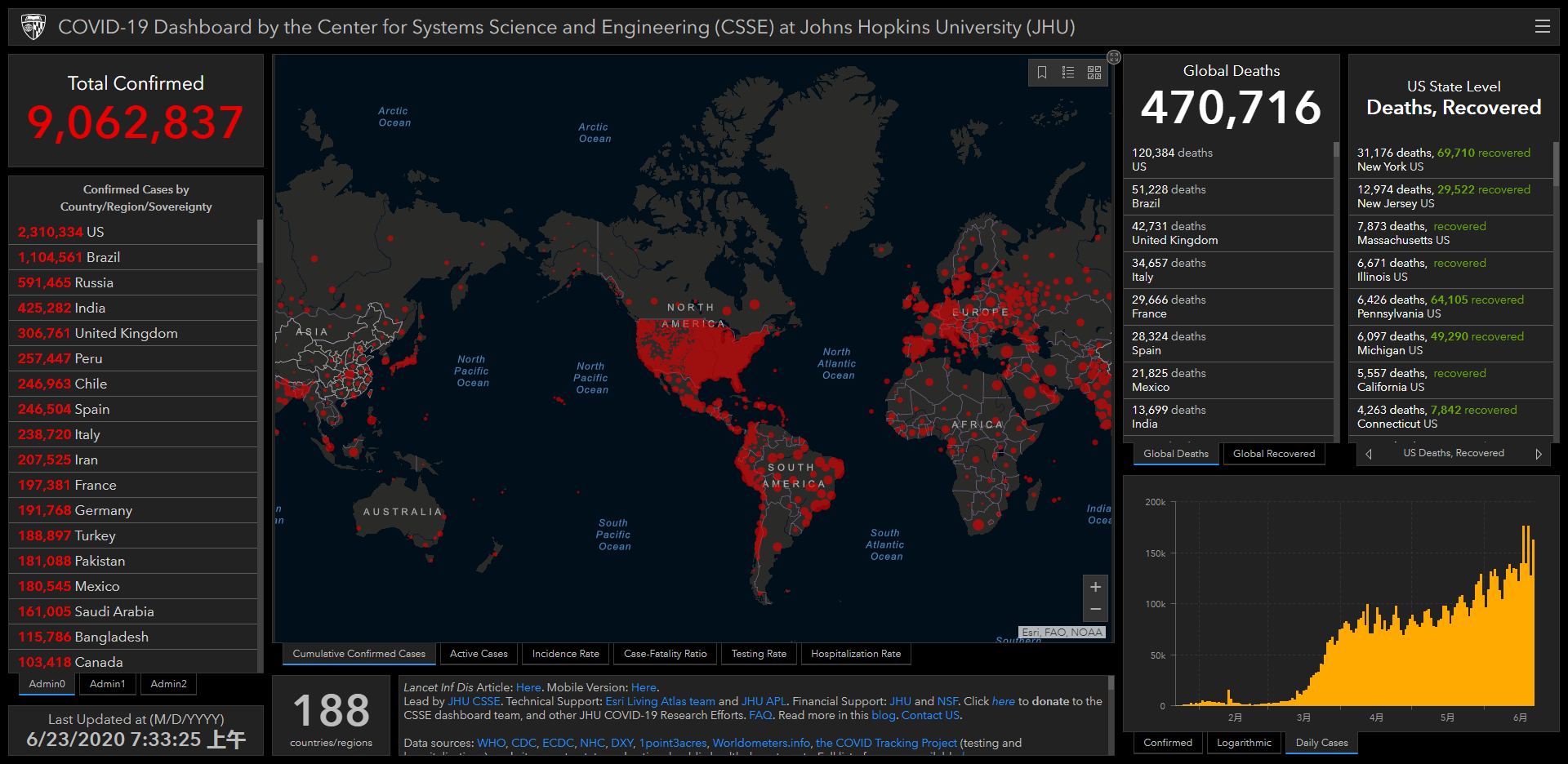 【香港商報網訊】隨着多國重啟經濟及放寬抗疫措施,新冠肺炎疫情近日有回升趨勢。世衛昨日公布,全球於周日新增逾18.3萬宗確診病例,再創單日新高;其中,北美洲和南美洲新增逾11.6萬宗病例。约翰斯·霍普金斯大学的统计数据显示,截至香港时间23日7:33,全球確診已突破900萬宗,累計死亡超过47萬人。