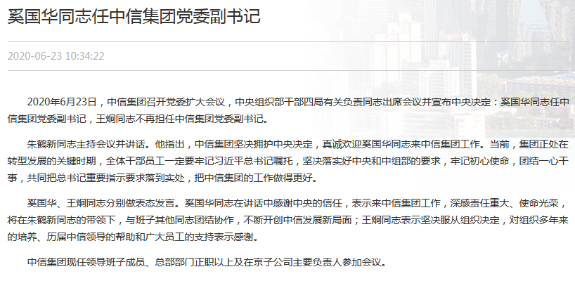 【香港商報網訊】6月23日,中信集團召開黨委擴大會議,中央組織部幹部四局宣佈中央決定,奚國華任中信集團黨委副書記,接替上周五刚刚退休的中信集团原副董事长、总经理、党委副书记王炯。