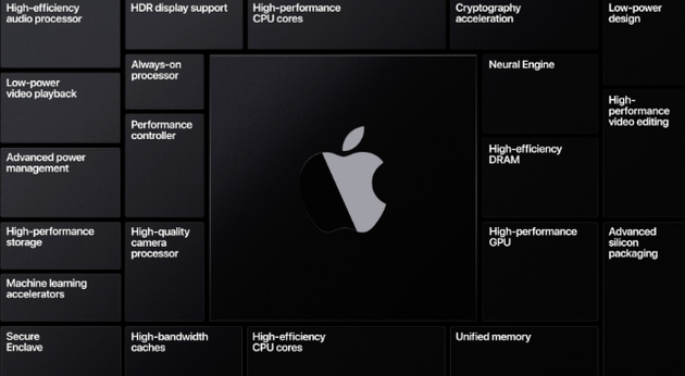 与传统的CPU厂商不同,苹果在自研芯片上积累了很多技术,他们推出的自研芯片实际上整合了大量子单元,除了CPU、GPU之外还有NPU、音频、视频等等,更重要的是苹果还可以将自家的软件整合在一起。