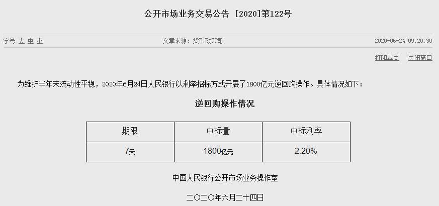 【香港商报网讯】据央行网站24日消息,央行公告称,为维护半年末流动性平稳,2020年6月24日人民银行以利率招标方式开展了1800亿元7天期逆回购操作;中标利率2.20%,与上次持平。因今日无逆回购到期,当日实现净投放1800亿元。