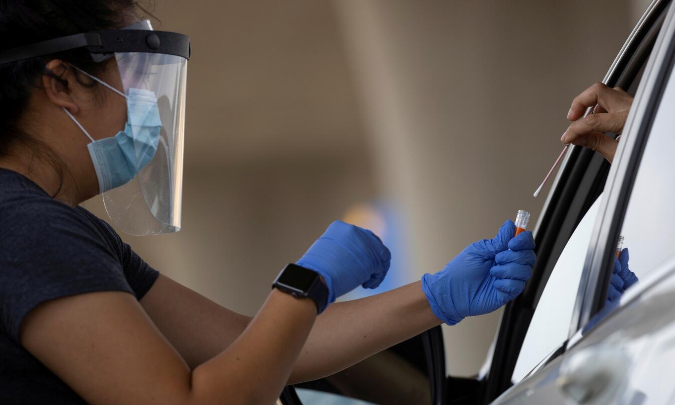 加州聖地亞哥COVID-19檢測點,護士在採集樣本。路透社