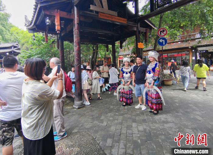 遊客在西江千戶苗寨景區內與穿着苗族服飾的少女合影留念。(中新社)