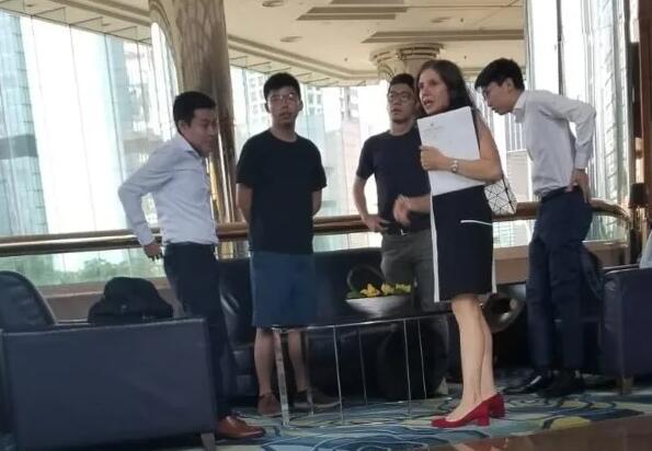 「港独」组织「香港众志」头目黄之锋(左二)等人曾与美国驻港澳总领事馆政治组主管(右二)会面。
