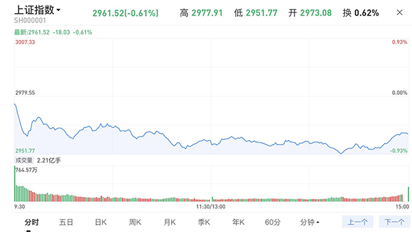 上證指數低開6點,其後反覆走軟,全日收市報2961點,跌18點或0.61%,最低見2951點,跌27點或0.93%,成交2938.86億元。