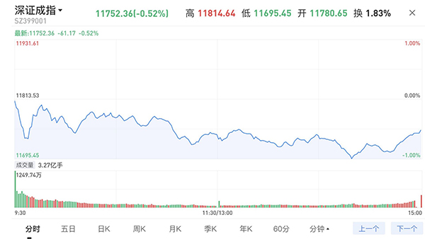 深成指亦低開低走,全日收市報11752點,跌61點或0.52%,最低見11695點,跌118點或1%,成交4223.8億元。