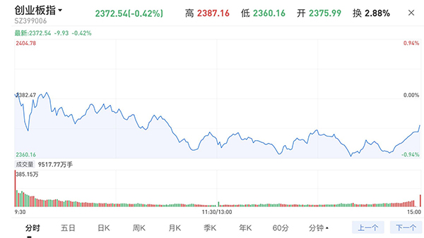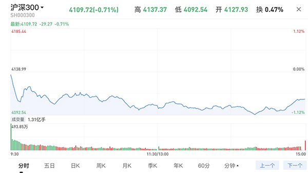 滬深300指數報4109點,跌29點或0.71%;創業板指數報2372點,跌9點或0.42%。