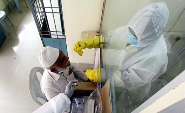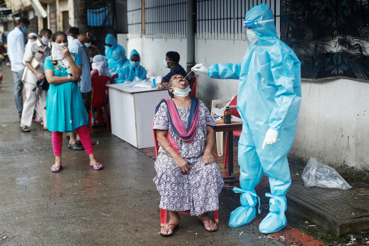 为加强防疫,印度卫生人员为孟买郊区居民进行深喉唾液测试。路透社