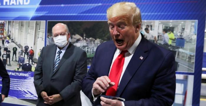当地时间5月21日,美国总统特朗普在密歇根州福特工厂视察时被媒体拍到仍未佩戴口罩。中新网