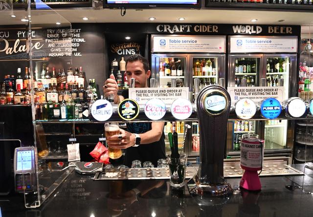 7月4日,在英国伦敦的一家酒吧,服务员为顾客准备饮品。新华社