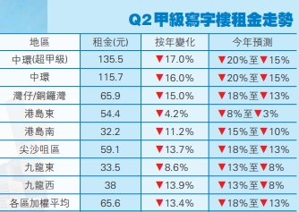 據該行統計,第二季中區超甲廈及甲廈平均呎租分別為135.5元及115.7元,年初至今租用各跌10.9%及11.3%,預期兩類商廈全年將跌15%至20%。至於灣仔及銅鑼灣呎租為65.9元,年初至今下跌10.4%;尖沙咀及西九龍呎租各為59.1元及38元,年初至今各跌10.7%及9.5%,該行料整體寫字樓租金全年跌13%至18%。