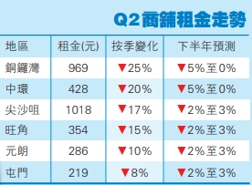 戴德梁行執行董事、香港商舖部主管林應威指出,在持續封關下,零售業銷售大跌,令商舖租金急跌,四大核心零售區租金首季下跌15%至25%不等,當中以銅鑼灣下調幅度最大。單計上半年,四大核心零售區累積租金下跌28%至36%。空置率方面,旺角高達23.6%、尖沙咀錄11.9%、銅鑼灣亦有7.9%;中環雖然達12.7%,但空置率較第一季的14.2%減少。