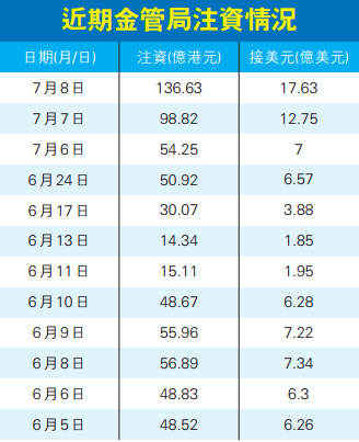 事實上,市場不斷有資金流入香港,反映市場並不擔心港元有風險。金管局昨天二度入市,在紐約市尾段接美元沽出21.93億港元,單日向市場注入超過103億港元,是4月底以來最多,令本周四的銀行體系總結餘進一步增至1491.26億港元。金管局連日在香港及紐約時段接美元,本星期一分兩次沽出54.25億港元及17.44億港元,星期二分兩次沽出81.38億港元及21.93億港元。