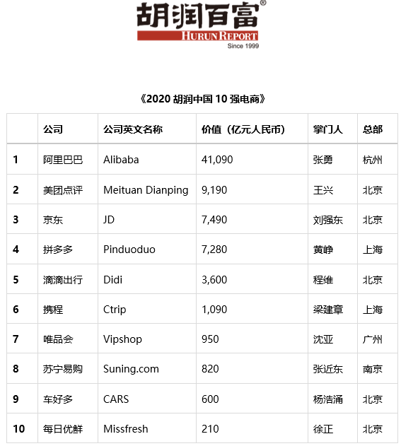 《2020胡润中国10强电商》榜单中列出了中国10强本土电商企业,按照企业市值或估值进行排名。上市公司市值按照2020年6月30日的收盘价计算,非上市公司估值参考已公开的、最新一轮融资估值。非上市公司由私募股权大数据-烯牛数据提供支持。据了解,这是胡润研究院首次发布该榜单。
