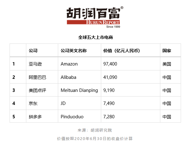 数据显示,天猫淘宝母公司阿里巴巴以4.1万亿价值成为中国最值钱电商,美团点评最近五个月增长80%,京东增长一倍,拼多多增长1.5倍,分别以9190亿、7490亿和7280亿元价值排名第二至第四。