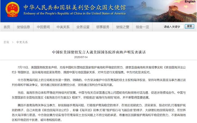 中国驻美国使馆发言人就美国国务院涉南海声明发表谈话