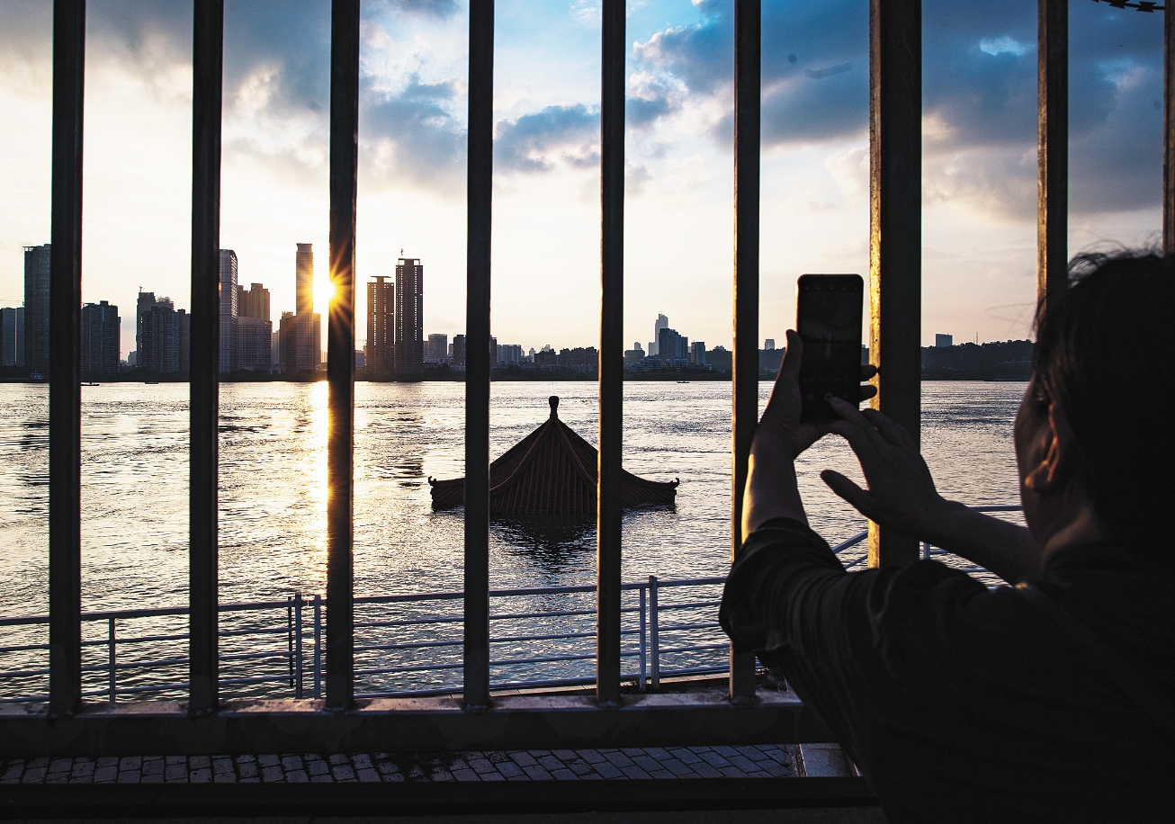 武漢市民在即將被淹沒的武昌黃花磯涼亭前拍照。 新華社
