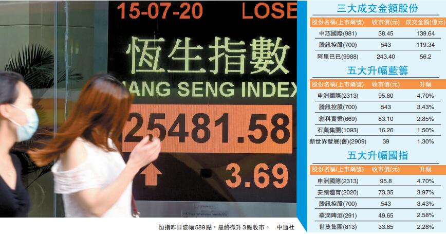 幾隻藍籌股創新高。蒙牛乳業(2319)開市挾上36.55元歷史高位後回吐,收市倒跌0.7%報34.8元。中生製藥(1177)及創科實業(669)早段亦破頂,收市分別升0.8%及2.8%。此外,周四回歸A股科創板上市的中芯國際(981)早段爆上44.8元新高後「散水」,收市倒跌8%報38.45元。