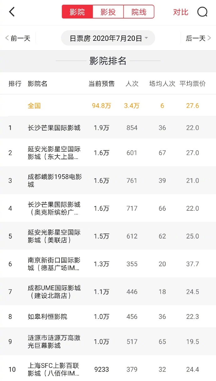 【香港商报网讯】据猫眼专业版数据,截至7月19日,全国83个城市391家影院复工首日(7月20日)的预售分账票房达94.8万,观影人次3.4万。如果计入每张3元的服务费,7月20日全国预售票房已经超过百万。