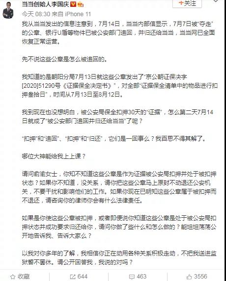 李國慶還喊話俞渝,稱當當公章屬於扣押證據,請歸還警方。