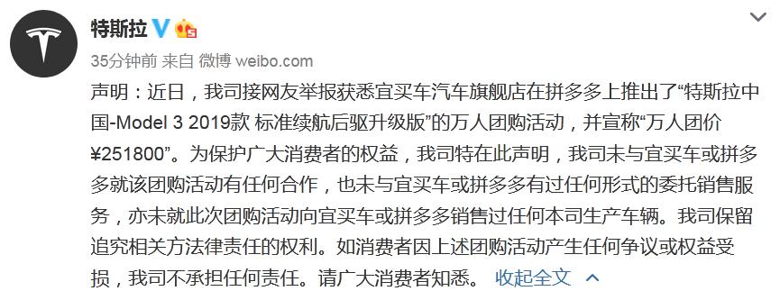 【香港商报网讯】近期,拼多多上出现2019款特斯拉Model 3的限时秒杀万人团购活动,到手价为25.18万元。对此,特斯拉21日发布声明称,未与宜买车或拼多多就该团购活动有任何合作,也未与宜买车或拼多多有过任何形式的委托销售服务,亦未就此次团购活动向宜买车或拼多多销售过任何本司生产车辆。特斯拉还表示,如消费者因上述团购活动产生任何争议或权益受损,特斯拉不承担任何责任。