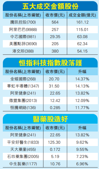 港交所昨日升近一成,收報見380元創新高,為升幅最大藍籌。騰訊U盤時段再拉升,最終升近8%,收報564元平新高。阿里巴巴(9988)權重佔8.53%,亦急彈7.3%或17.4元,收報257元,創收市新高,成交金額破百億至115.01億元,市值達5.515萬億元。除了獲納入恒生科技指數外,阿里旗下、支付寶母企螞蟻集團A+H同步上市,市場分析將有利阿里釋放價值。阿里健康、微盟(2013)均升逾一成。