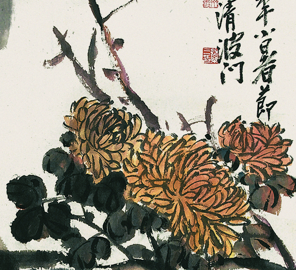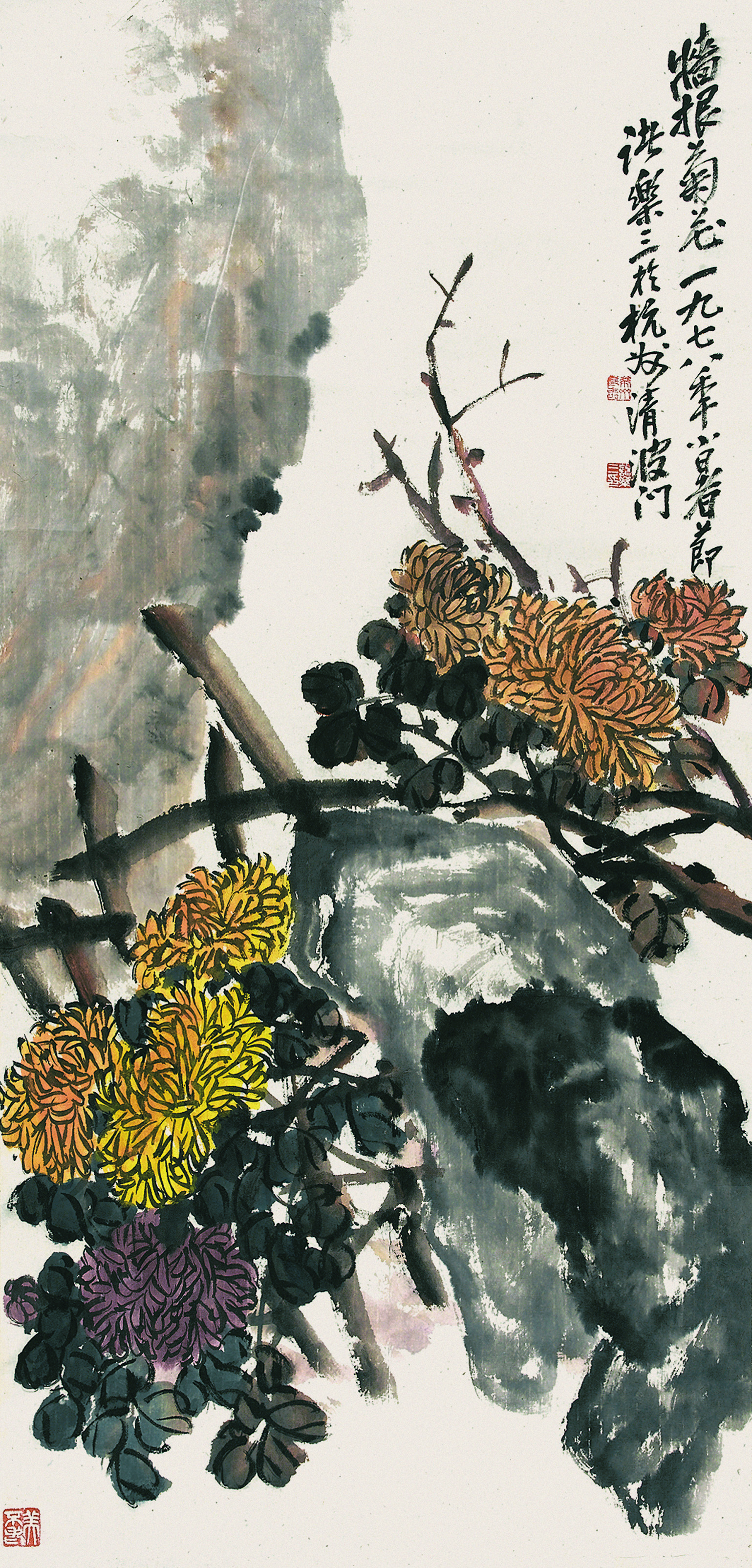 《牆根菊花》乃諸樂三七十六歲時創作的佳構。從構圖形式到筆墨技巧,儼然自缶翁而出。可細細品味,卻又比吳昌碩畫作多了幾分秀逸之氣。諸樂三晚年從吳氏「金石味」中脫出,回歸傳統文人畫趣味,又吸收青藤的豪放、白陽的靈秀、八大的奇崛、石濤的多變,廣採博覽,開拓了「形氣兼重」的繪畫風貌,由此畫作可見一斑。