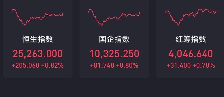 截至收盤,恒生指數漲0.82%,報25263點;國企指數漲0.8%,報10325.25點;紅籌指數漲0.78%,報4046.64點。大市成交額1405.72億港元。