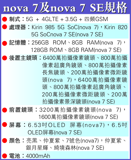 為配合香港的5G網絡,nova 7配備旗艦級的Kirin 985 5G處理器、8GB RAM、256GB內置儲存空間。nova 7 SE用上Kirin 820 5G處理器、8GB RAM及128GB 內置儲存空間。全新5G人工智能處理器,配合軟件和硬件的升級,為用家帶來強大的處理能力、圖像能力及AI能力。