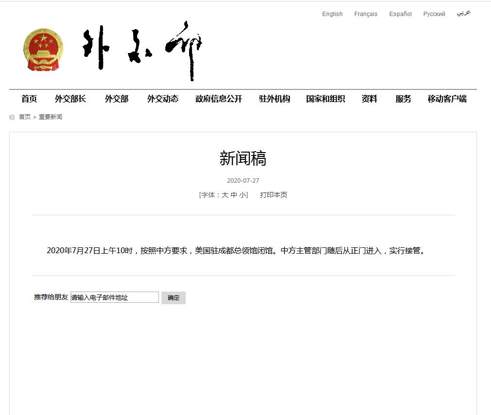 【香港商报网讯】据外交部网站消息,7月27日上午10时,按照中方要求,美国驻成都总领馆闭馆。中方主管部门随后从正门进入,实行接管。