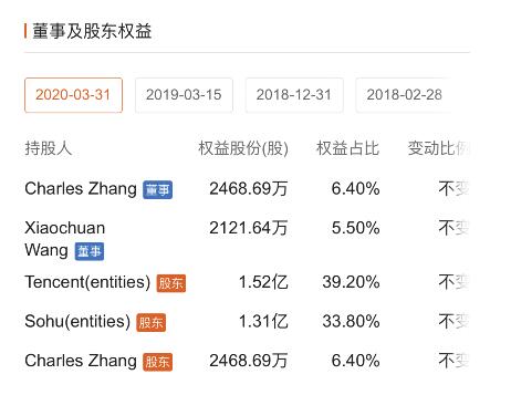 截至2020年3月31日,腾讯持有搜狗近40%的股权,搜狐公司持有33.8%,张朝阳持有6.4%,搜狗的CEO王小川持有5.5%。