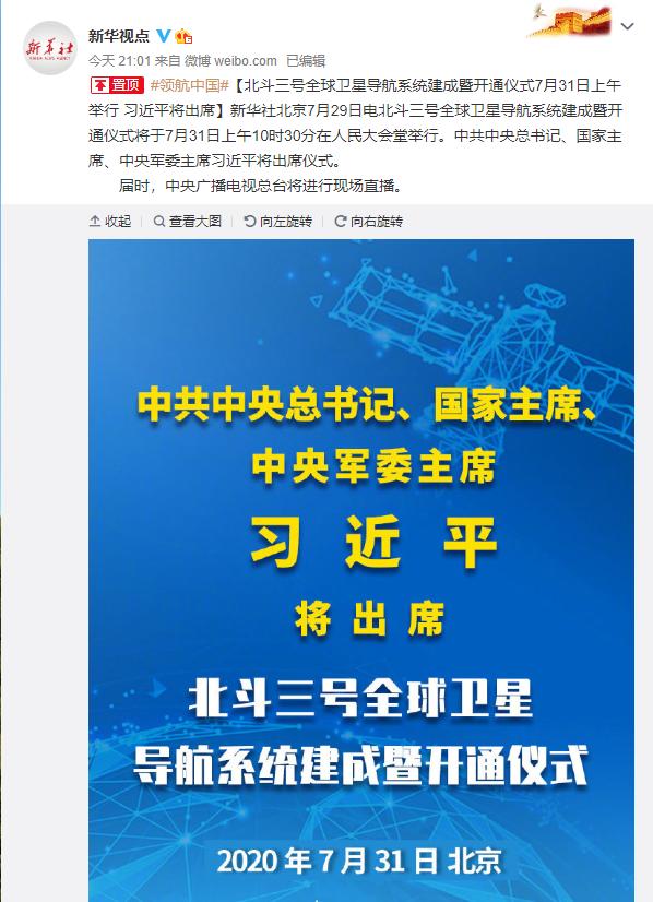 据新華社消息,北斗三號全球衛星導航系統建成暨開通儀式將於7月31日上午10時30分在人民大會堂舉行。中共中央總書記、國家主席、中央軍委主席習近平將出席儀式。