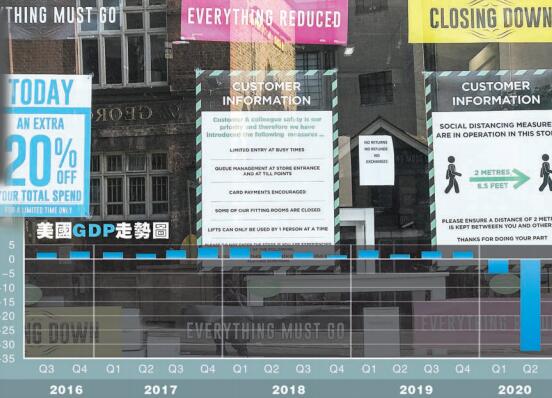 【香港商報網訊】美國商務部昨日公布的首次預估數據顯示,美國第二季度GDP按年下滑32.9%,是上世紀40年代以來的最大跌幅。席捲全球的新冠肺炎疫情下,除了投資及淨出口疲軟外,還有多州頒布居家令並關閉非必要營運場所,重創餐飲、零售、旅遊等領域的消費者支出,令佔美國經濟七成比重的消費引擎熄火。這些都對第二季GDP形成拖累,致使美國經濟大幅萎縮。
