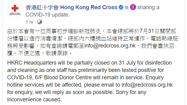 香港紅十字會今日(31)於社交平台指,位於西九龍海庭道19號的紅十字會總部一人初步確診新冠肺炎,總部將於今日關閉部份樓層以進行消毒清潔,而六樓捐血站維持正常運作。