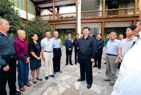 2019年9月16日至18日,中共中央总书记、国家主席、中央军委主席习近平在河南考察。这是16日下午,习近平在位於信阳市新县的鄂豫皖苏区首府革命博物馆,同当地红军後代、革命烈士家属代表亲切交谈。 新华社记者 鞠鹏/摄
